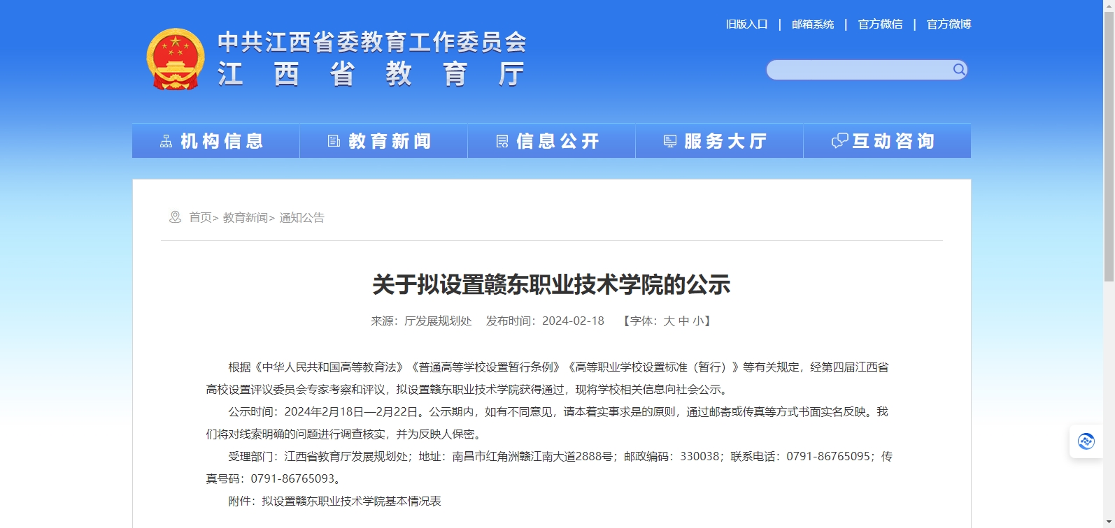 根據(jù)《中華人民共和國高等教育法》《普通高等學校設置暫行條例》《高等職業(yè)學校設置標準(暫行)》等有關規(guī)定,經第四屆江西省高校設置評議委員會專家考察和評議,擬設置贛東職業(yè)技術學院獲得通過,現(xiàn)將學校相關信息向社會公示。