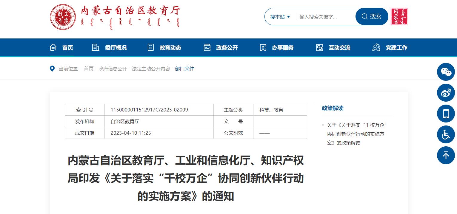 內(nèi)蒙古自治區(qū)教育廳等3部門聯(lián)合印發(fā)《關(guān)于落實“千校萬企”協(xié)同創(chuàng)新伙伴行動的實施方案》